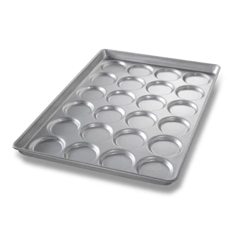 This Chicago Metallic ePAN Pan has 24‐cavities and can be used to bake hamburger buns, muffin tops, or cookies. It is made from high‐tensile‐strength aluminized steel and has a glazed finish for non‐stick properties. Made for commercial ovens, does not fit most residential ovens.