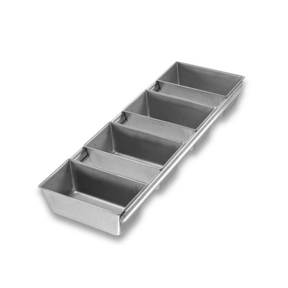 This Chicago Metallic Open Top Bread Pan allows you to make four loaves of bread at a time. It is made from 26 gauge aluminized steel, and has a glazed finish for non‐stick properties.