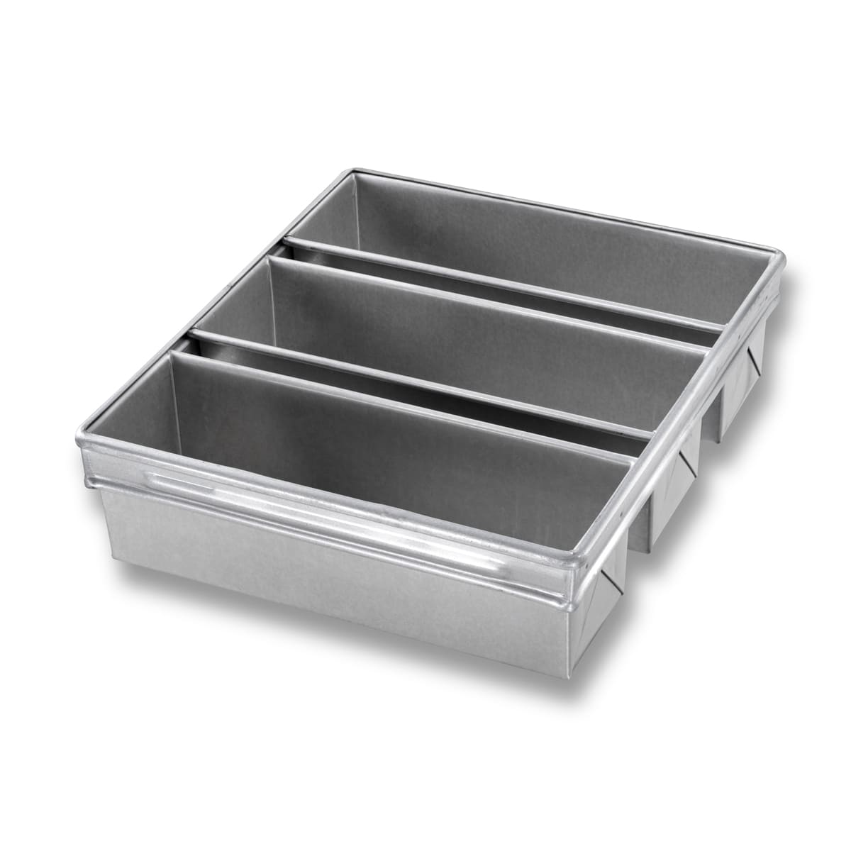 This Chicago Metallic Pullman Pan allows you to bake up to three loaves of bread at once. It is made from 26 gauge aluminized steel, and has a glazed finish for non‐stick properties.