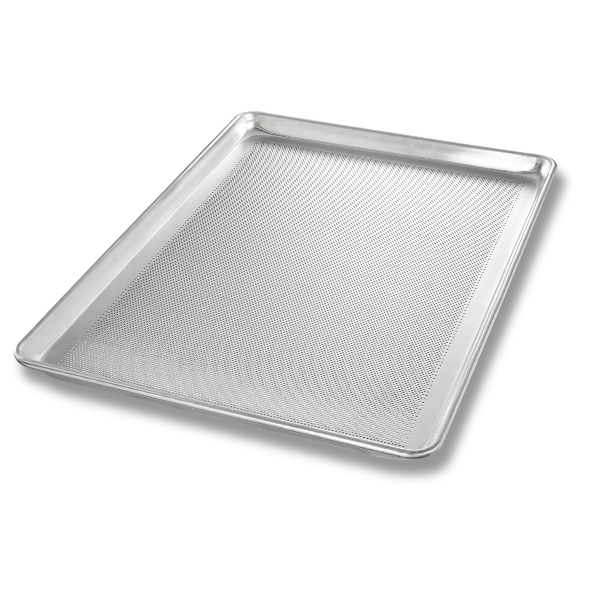 This 16 gauge aluminum sheet pan is perforated for better heat transfer and evenly baked cookies or rolls.
