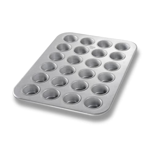 This Chicago Metallic Pan allows you to bake up to 24 mini‐muffins or other baked goods. It is made from 26 gauge aluminized steel and has a glazed finish for non‐stick properties.
