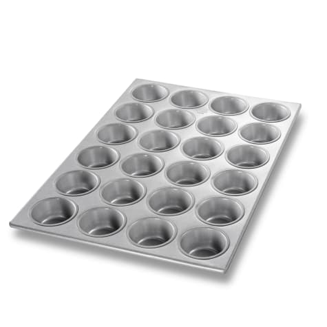 This Chicago Metallic Pan allows you to bake up to 24 cupcakes or muffins at a time. It is made from aluminized steel and has a glazed finish for non‐stick properties.