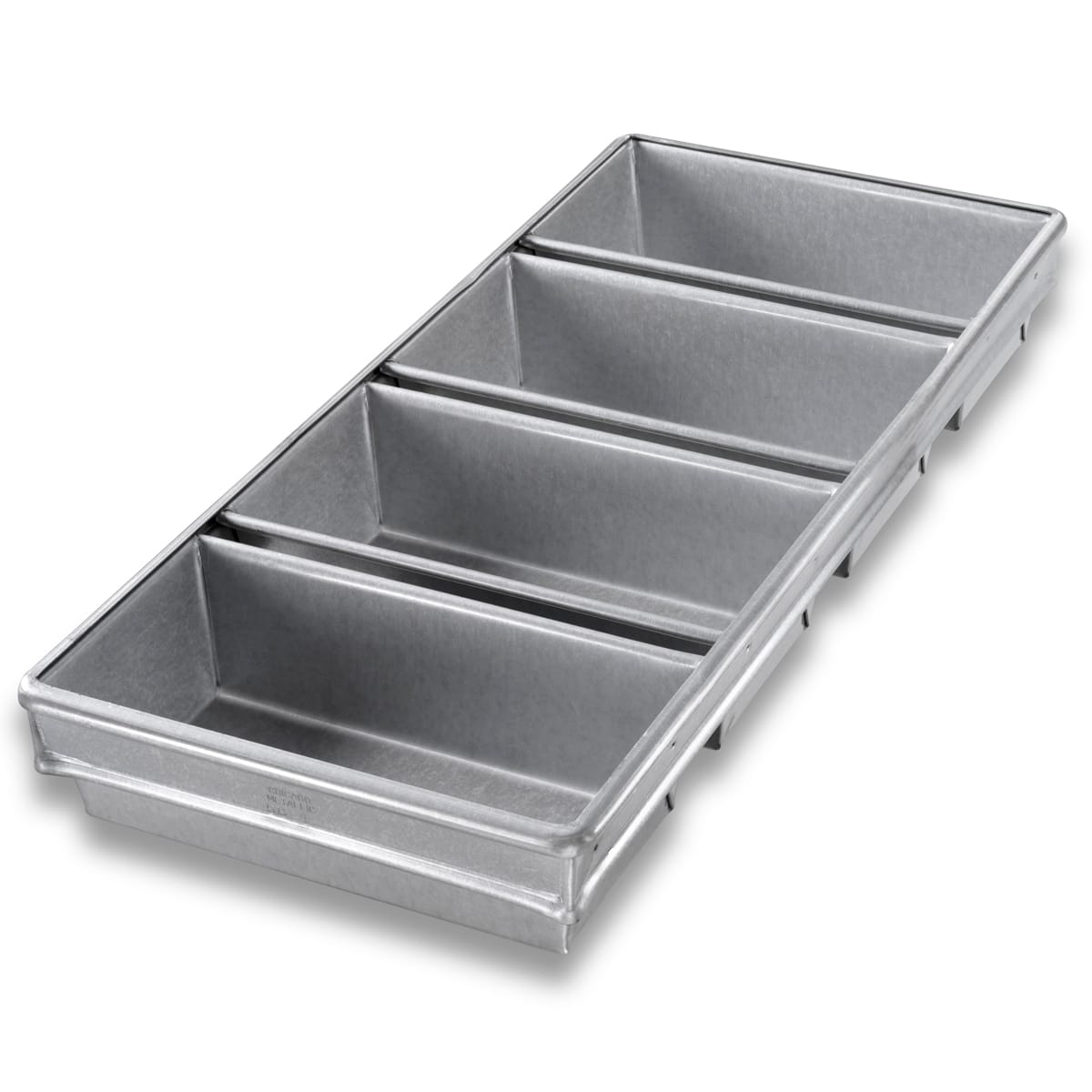 This Chicago Metallic Open Top Bread Pan allows you to bake up to four loaves of bread at once. It is made from 26 gauge aluminized steel, and has a glazed finish for non‐stick properties.