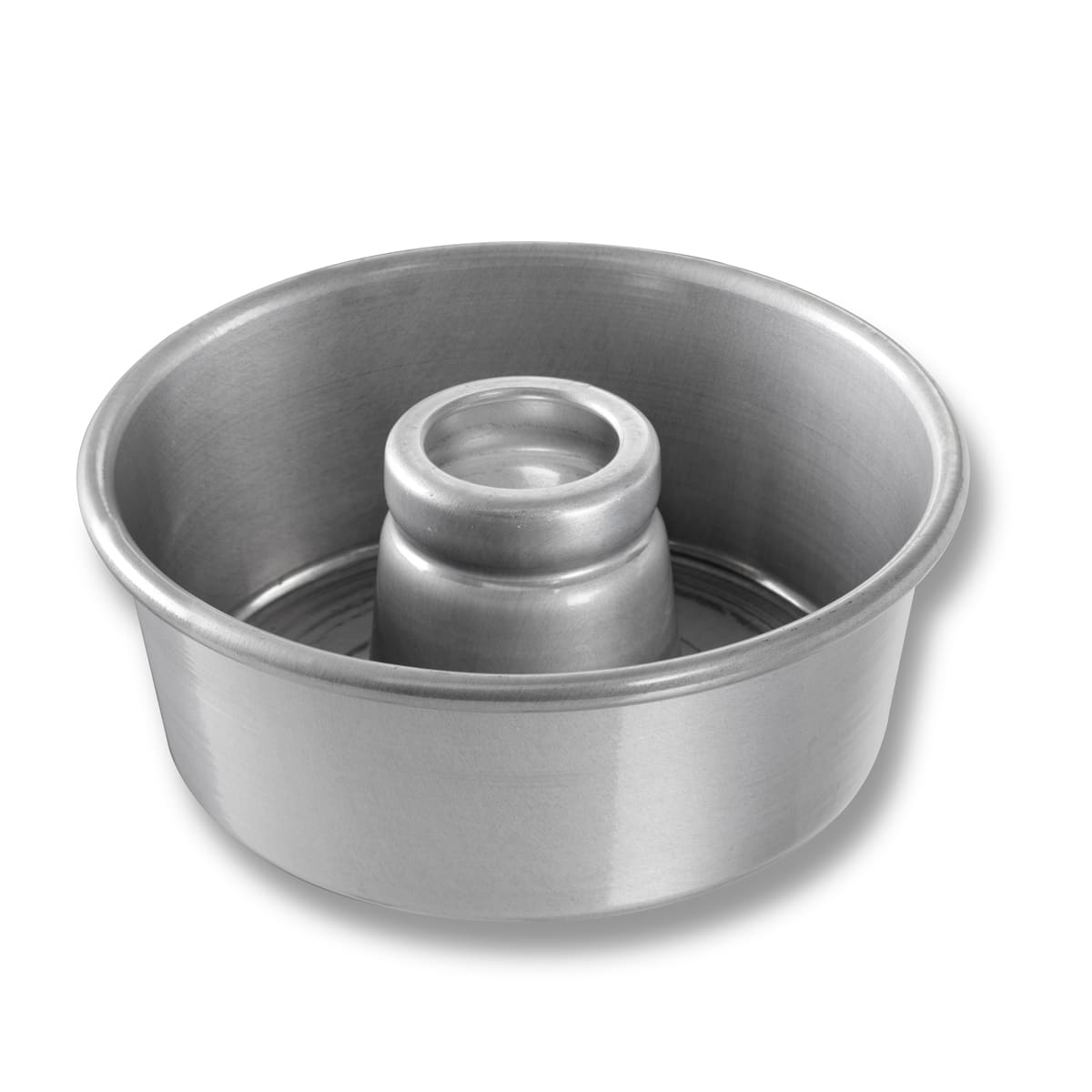 This Chicago Metallic Pan is great for making angel food cake or tube cakes. It is made from aluminum and has a plain finish. It is a 7.5 Inches size.