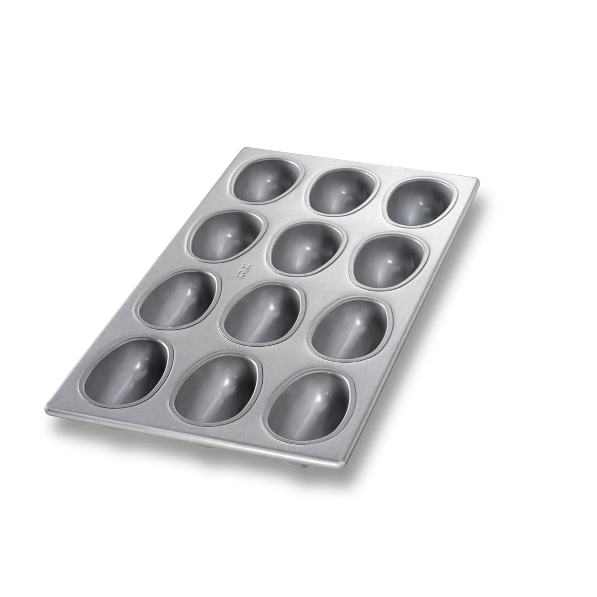 This Chicago Metallic Pan Set allows you to bake up to 12 small Easter egg or football shaped cakes, great for holidays and parties. It is made from 26 gauge aluminized steel with a glazed finish for non‐stick properties.