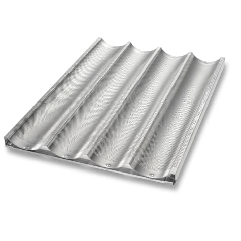 This Chicago Metallic Uni‐Lock Pan allows you to bake up to four baguettes or other types of French bread at a time. It is made from 16 gauge aluminum and has a patented locking method to provide a permanent connection between the frame and panel. Made for commercial ovens, does not fit most residential ovens.