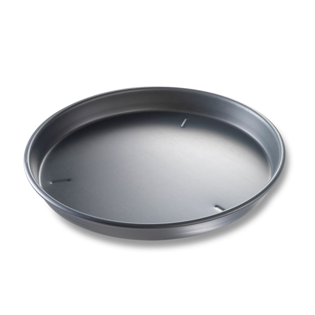 This Chicago Metallic Deep Dish Pizza Pan is made from BAKALON high‐strength aluminum, which has a hardcoat anodized surface that will not chip, peel, rust, or interact with food. It is 14 gauge and has a nestable design.