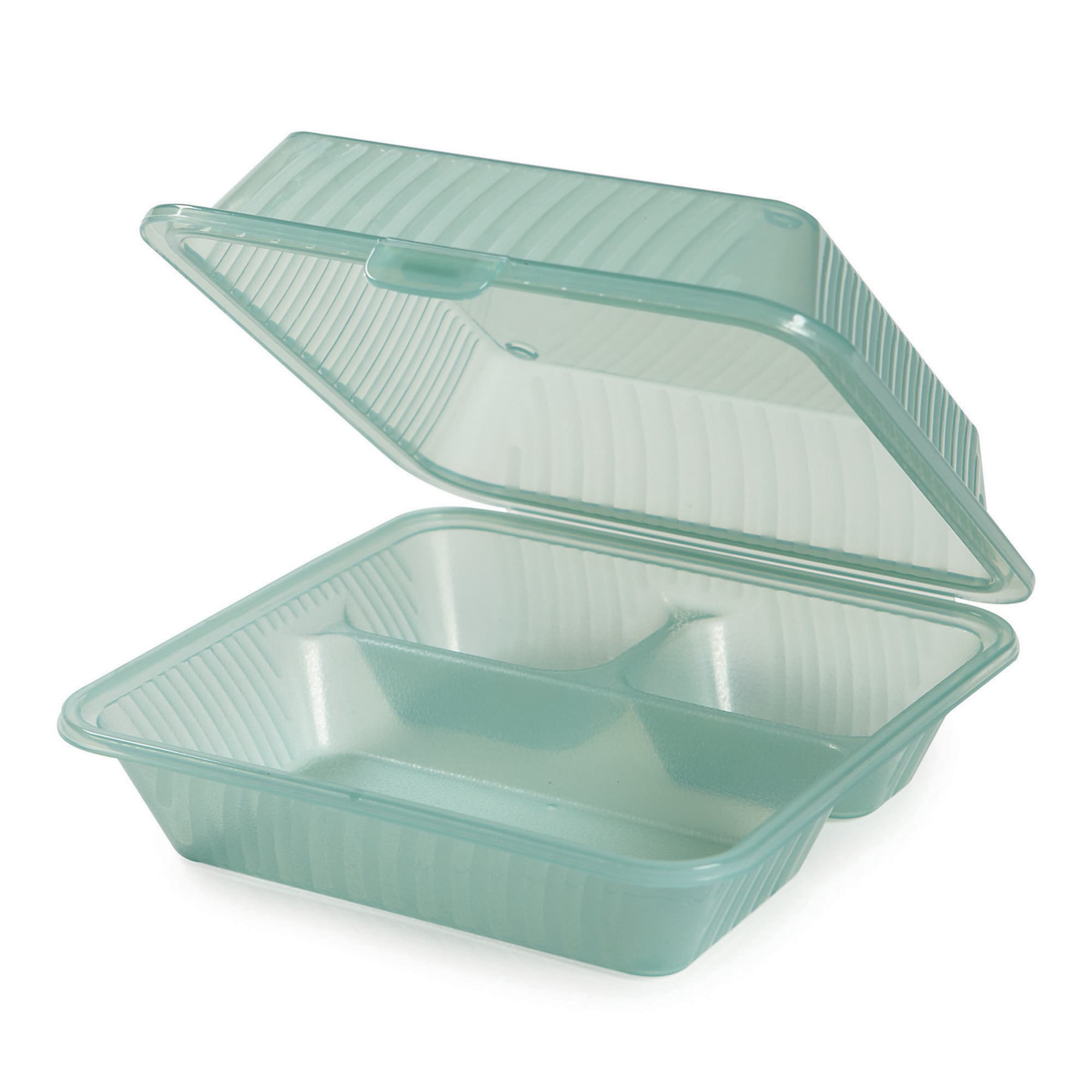 These Eco‐Takeouts® clear 3‐compartment clamshell containers are made of polypropylene to be both microwave and dishwasher safe. They are re‐usable and great for catered events or a brown bag lunch.
