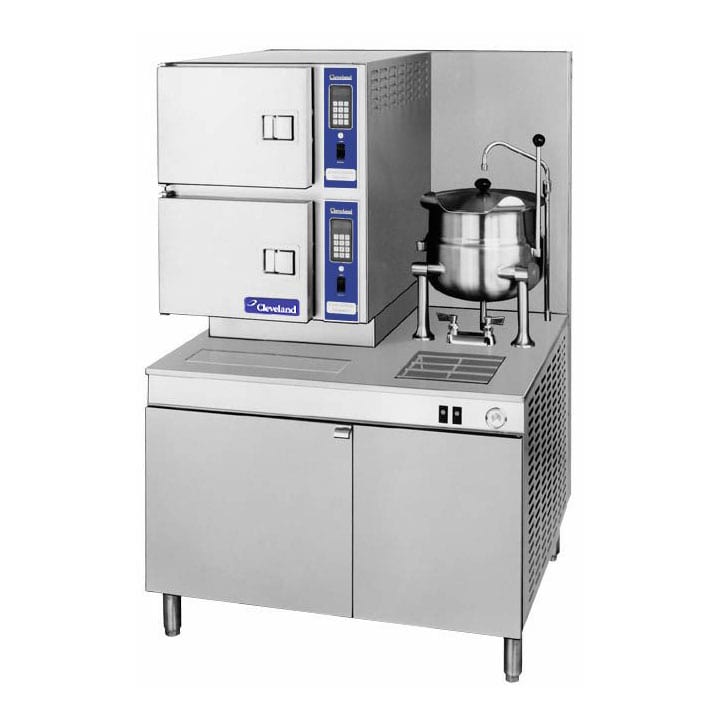 This kettle steamer combination from Cleveland range features the exclusive convection Jets that produce high velocity steam without fans. You also get pressureless cooking with convection steam so you an open the door during the steaming process.