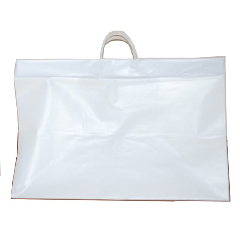 The Command Packaging F22IR plastic shoppers features rigid handles, cardboard bottom insert for added stability, and square bottom allows bags to stand unassisted.