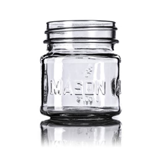 The G265 8 oz clear glass jar has a wide mouth and the word Mason" embossed on the front. There are fill lines of 1/3 cup