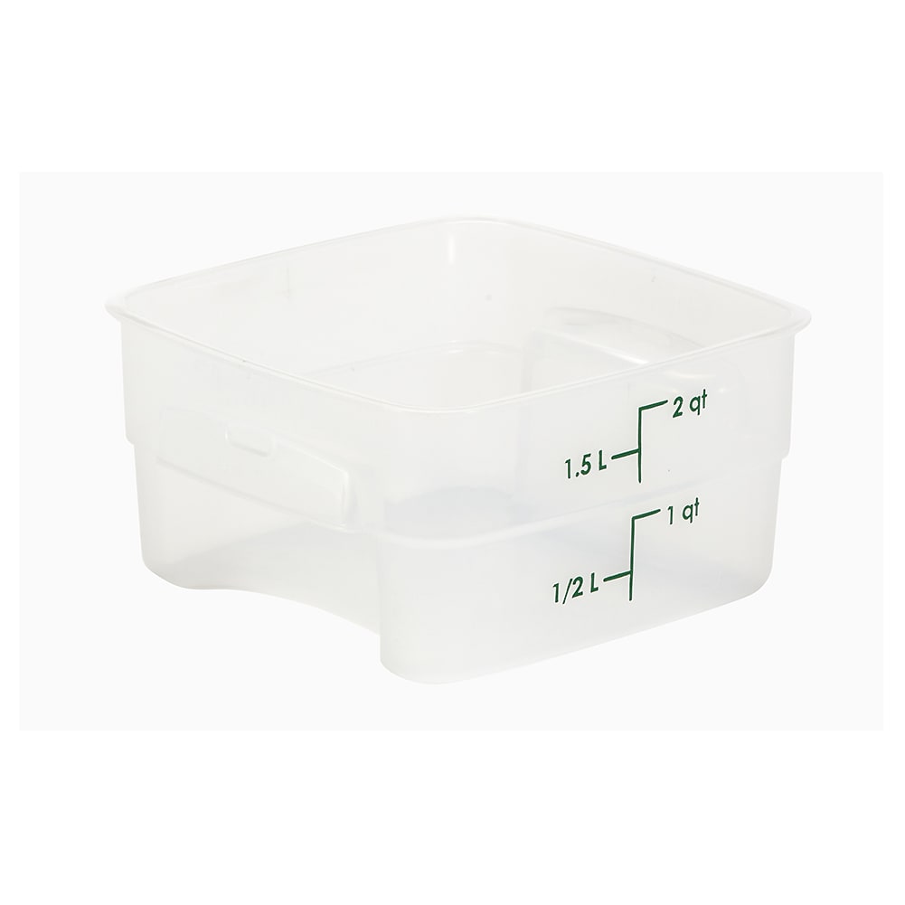 These 2 quart CamSquares® FreshPro Food Storage Containers are crafted from cost-effective polypropylene material, and are engineered for easy inventory checks, ensuring efficient use of storage space. The FreshPro series introduces a modern touch with carefully designed molded-in, recessed handles, optimizing space, promoting secure handling, and facilitating precise pouring.