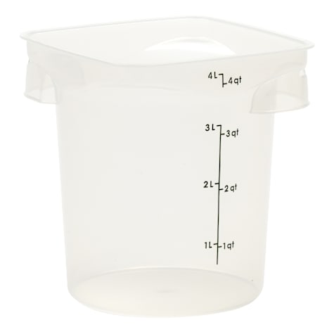 This Cambro container is a durable 4‑quart CamRound™ FreshPro food storage container designed for busy commercial kitchens. Made from translucent, BPA‑free polypropylene, it offers excellent visibility while resisting stains and odors for long‑lasting use. Green, easy‑to-read graduations support accurate measuring, and its molded-in handles and curved corners make pouring and handling safer and more efficient. Dishwasher safe and NSF certified, this container withstands temperatures from –40°F to 185°F, making it a versatile choice for prep, storage, and transport.
