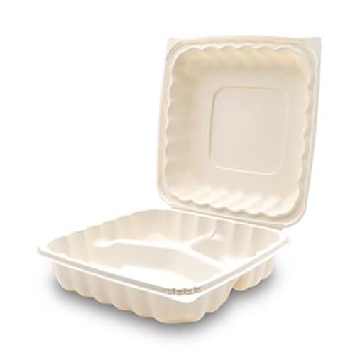 This EarthPro three compartment 9" x 9" hinged container features the Sure Grip locking system that guards against spills and leaks. They are stackable to save space and microwavable for reheating foods. Made using recyclable polypropylene, these containers are a great choice.