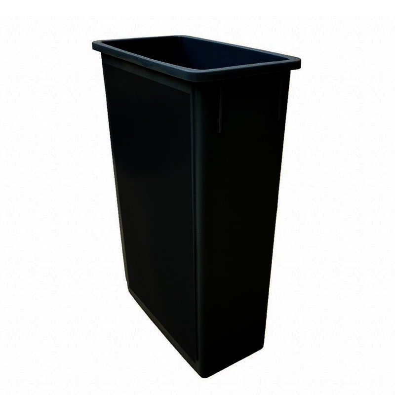 This black, slim plastic waste container has a small footprint and the square shape allows it to hold more trash that a round can. It is dent and crack resistant and is lightweight for easier transport.