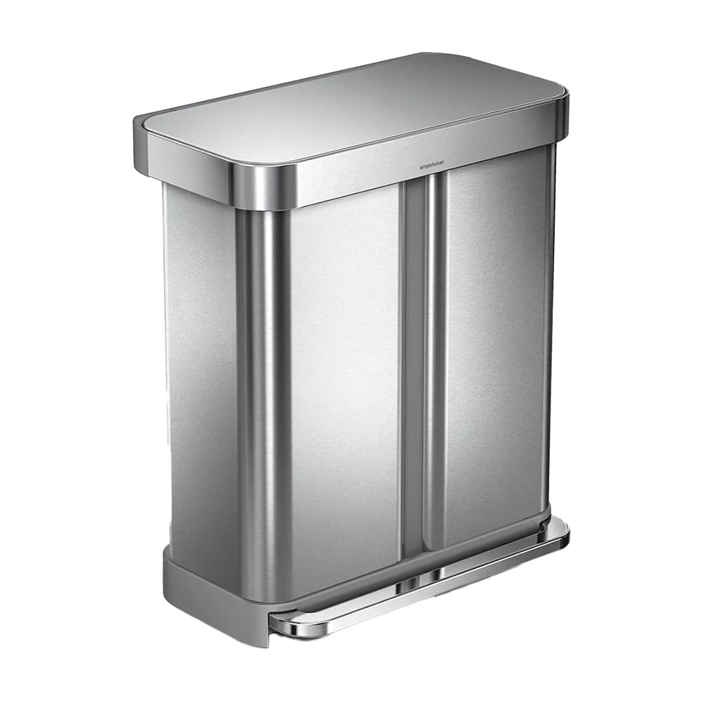 simplehuman dual compartment cans combine style and functionality for trash and recycling sorting. The steel pedal is built to withstand over 150,000 steps and the patented features lid shox technology for a slow, silent close. Each can comes with the odorsorb pod to eliminate odors for 45 days. The silver‐ion coating resists fingerprints and germs and the liner pocket stores extra can liners for convenience. The inner liners are crafted from 100% post‐consumer recycled plastic so these cans are eco‐friendly.