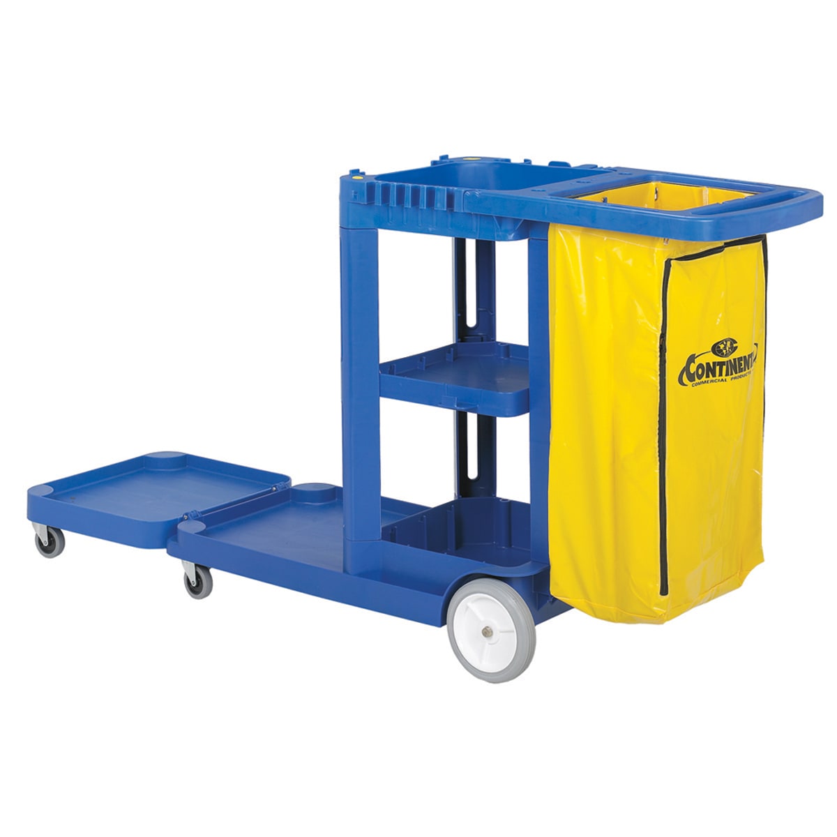 This blue 73" janitor cart includes a 25 gal zippered vinyl bag and features an extra tray segment that folds out for more carrying space. It can accommodate two 26 or 35 qt buckets with wringers