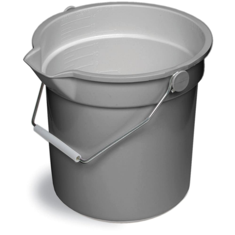 This gray 14 qt bucket features a durable steel handle and built-in pour spout. It also has graduations molded directly into the inside surface.