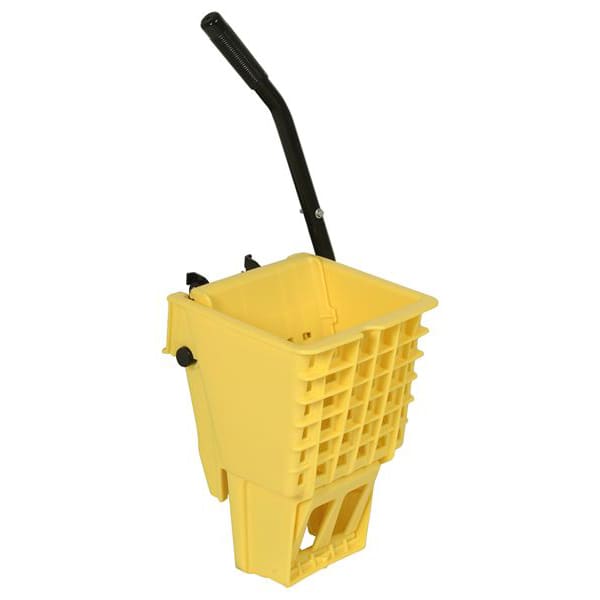 This yellow Splash Guard side press mop wringer can handle 12 to 32 oz mops and features an extended handle design for extra leverage and comfort. It also has a mop handle holder molded into the front and a smooth, non porous Derma Tek finish.