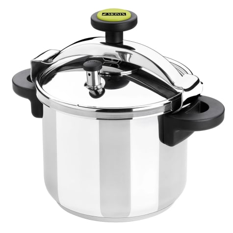 This pressure cooker from Matfer Bourgeat is made of 18/10 stainless steel and features a safety valve and heat diffusing sandwich bottom. It can be used on any hob types, including induction. Dishwasher safe.