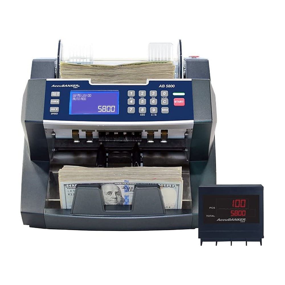 The AccuBANKER 5800 is a bank grade, multi-currency, bill counter suitable for counting both paper and polymer bills. The heavy-duty construction and three adjustable counting speeds (1,200; 1,500 and 1,800 bills per minute) make it ideal for fast-paced, high-volume businesses. The total batch value calculator allows users to obtain the total value of a batch for a selected denomination and the grand total value of all the batches counted. Keep track of these values on the unit's LCD display or through detailed printed reports by adding the AccuBANKER Thermal Printer (sold separately). The AB5800 is standardly equipped with a variety of counterfeit detection features such as ultraviolet detection, magnetic ink detection, double bill detection and size verification and will notify users with visual and audible alerts whenever double bill, suspicious bill size and chained bills are detected.