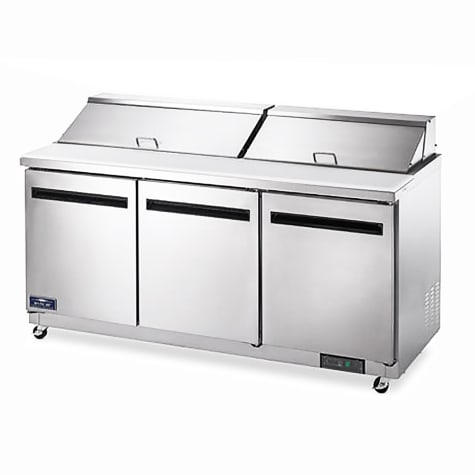 This Arctic Air prep table features high output fan motors, electronic thermostat with external digital display, bottom mounted compressor, and front accessible, bottom mounted condensing unit mounted on slide out rack for easy maintenance and cleaning.