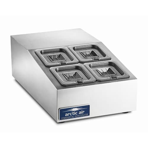 This compact refrigerated countertop prep unit has a durable stainless steel design and comes with four sixth size food pans.
