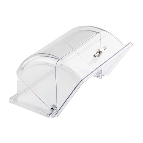 This TableCraft Rectangular Polycarbonate Roll Top Cover measures 13 1/2" x 11" x 7 1/2". Designed for half-size crates, trays, and food pans, this cover offers excellent visibility and protection for food items, making it perfect for buffets, bakeries, and catering operations. The metal handle on the front allows both customers and employees easy access to products.