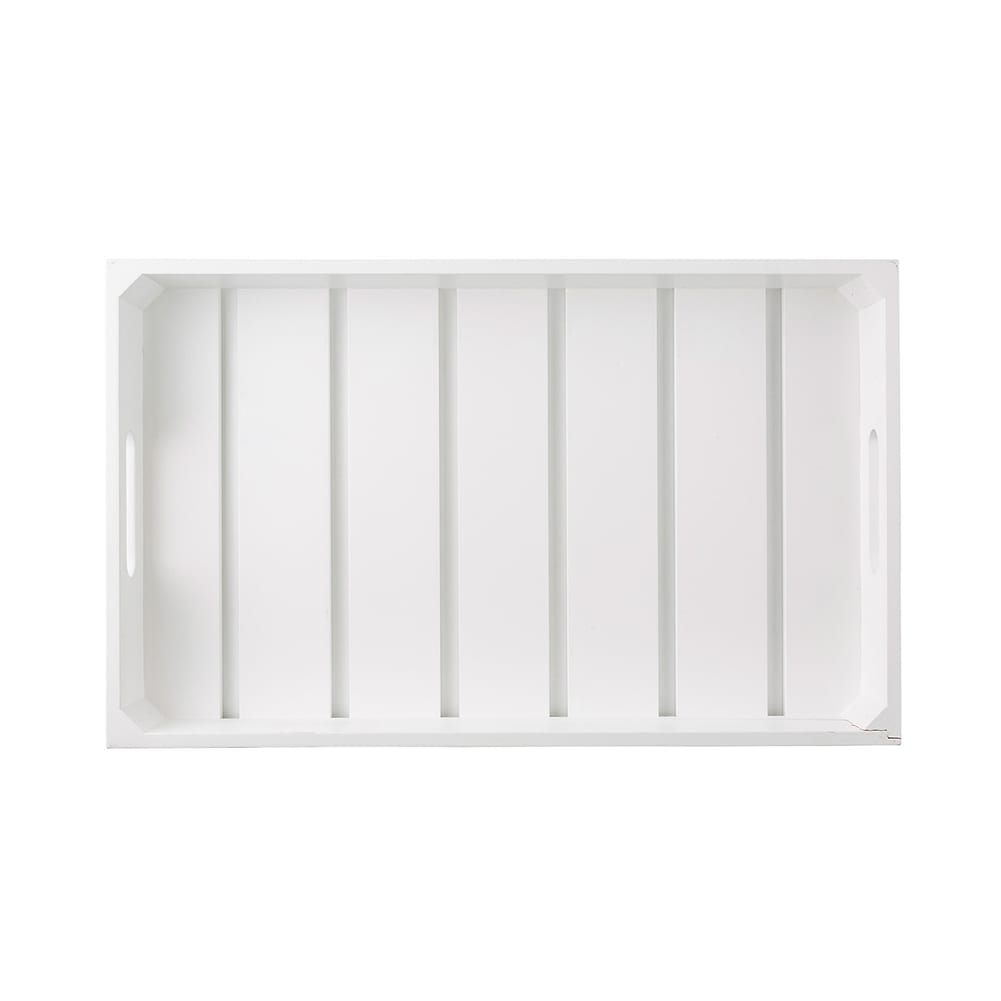 This TableCraft full-size white wood serving and display crate measures 20.75 inches by 12.75 inches by 2.75 inches. This versatile crate is designed to hold fruits, vegetables, breads, or dinnerware. Its built-in handles allow for easy transportation, and it can be flipped over to create a riser for a multi-dimensional display.
