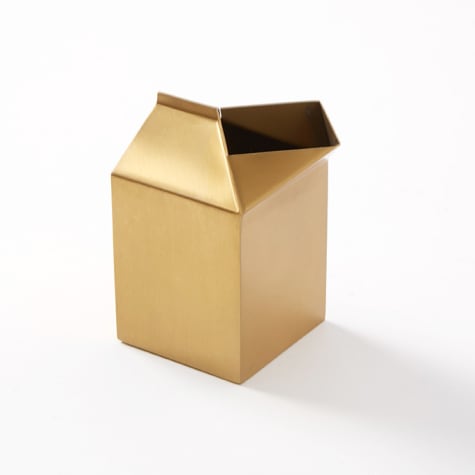 Elevate your beverage service with this 5-ounce creamer, designed in the shape of a classic milk carton. The stainless steel construction with a satin gold finish offers both durability and a touch of elegance. Ideal for serving milk, cream, or dressings, this creamer combines whimsical design with practical functionality.