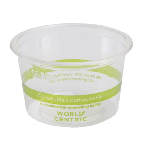 These World Centric® compostable 4 ounce clear portion cups are made from PLA, which is derived from plants. They are suitable for cold liquids, freezer safe and compost in 2 to 4 months in a commercial composting facility. Even though they are as light and strong as plastic, these disposable portion cups fully break down when commercially composted. These portion cups work well for condiments, sides, dips, dressings, or toppings. Not microwavable. PLA products should be stored in a cool place below 110° F and out of direct sunlight.