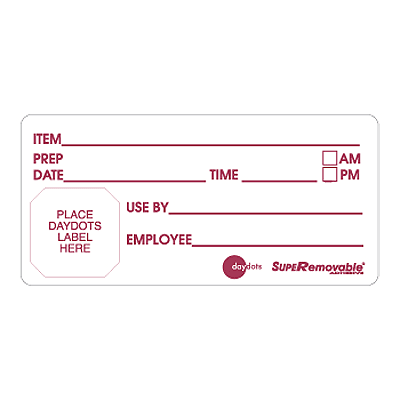 This SupeRemovable prep shelf life label from DayDots is great for keeping your food storage areas organized. This 4 x 2" label removes easily from metal.