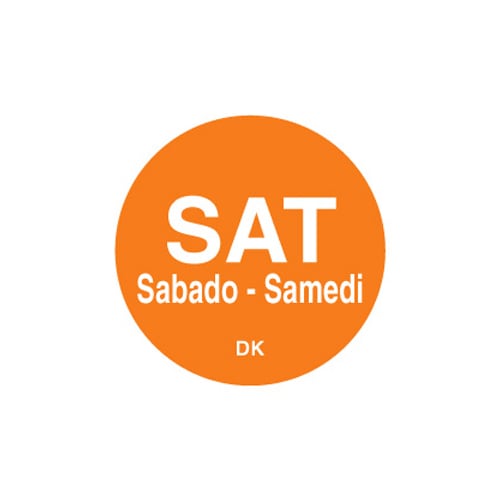 This ¾ round day label features the text Saturday in two languages and the aggressive