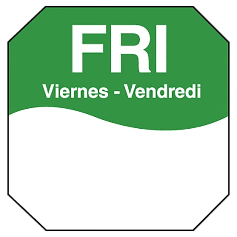 This 1in. octagonal day label features the text Friday in 3 languages and the convenient detach-tab technology of the MoveMark line. The tab on each label lets you easily remove it without leaving any harmful residue behind that could harbor bacteria.