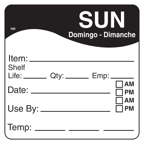 This 2½ square day label features the text Sunday in three languages with spaces for recording shelf life and temperature