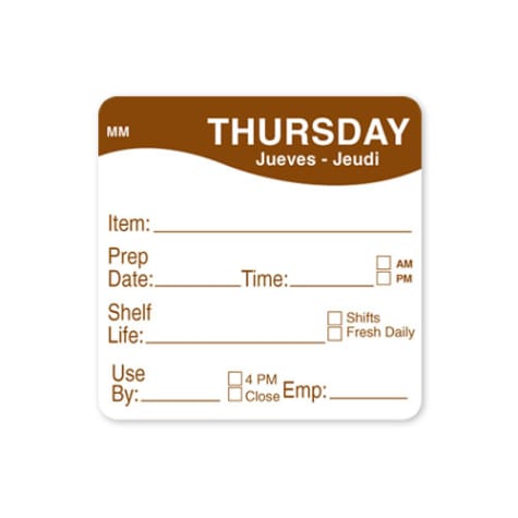 This 2" square day label features the text Thursday in three languages with an item / prep date / shelf life format and the convenient detach-tab technology of the MoveMark line. The tab on each label lets you easily remove it without leaving any harmful residue behind that could harbor bacteria, saving you time and maintaining food safety.