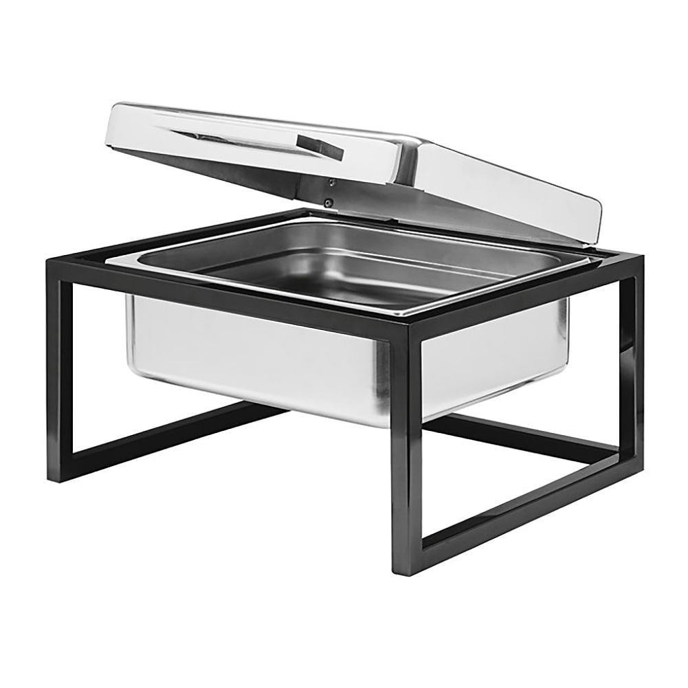 This 2/3 size chafing dish matches well with other items in the Abert Cosmo collection. This chafer has a modern style with black powder coated steel construction that is both durable and beautiful. The slotted lid allows steam to escape.