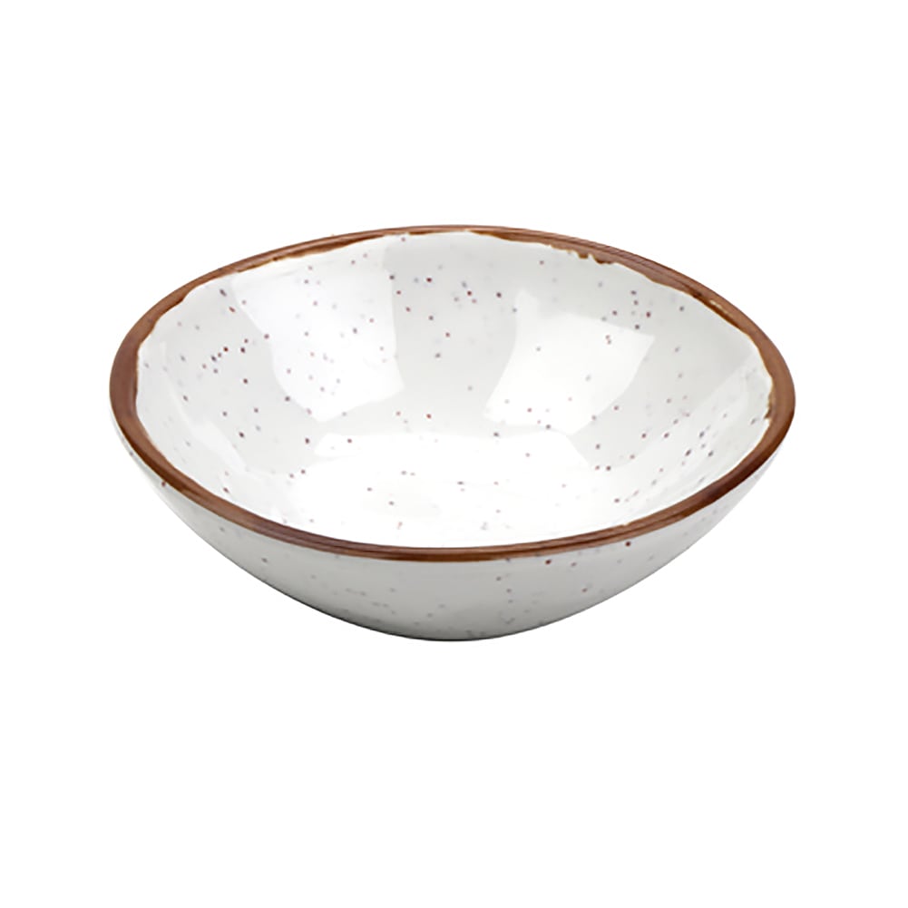 This 5 ounce monkey dish from G.E.T. Enterprises is part of the Rustic Mill Collection and features organic surface texturing, cream base with brown speckles and seemingly hand-painted brown rim.
