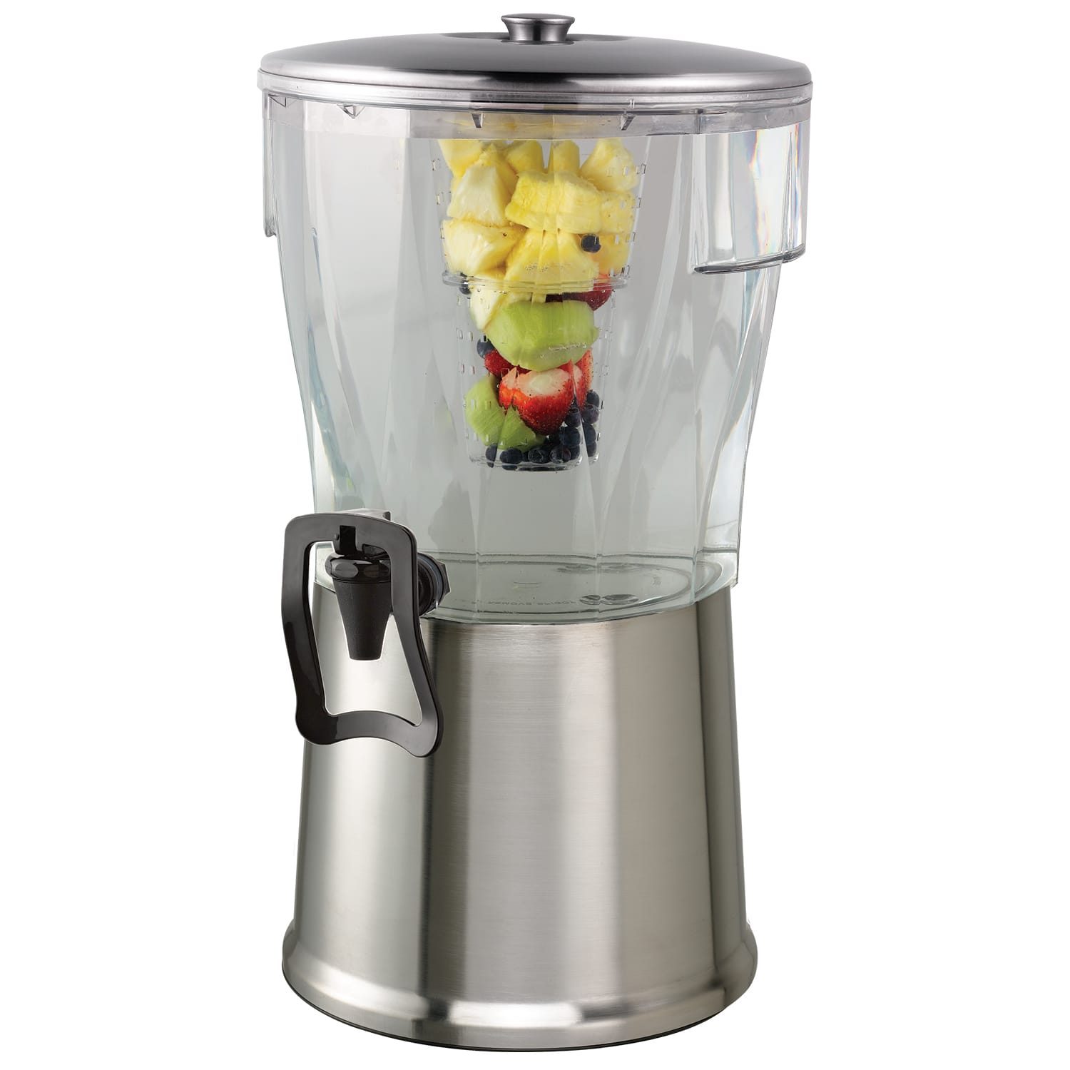 Guests will love the hands free operation of this Service Ideas Classic brushed finish round 5 gallon beverage dispenser. Simply press the cup against the actuator to dispense. This helps prevent the spread of germs and makes it easy to use. This dispenser includes a diffuser tube so you can customize your beverage choices.