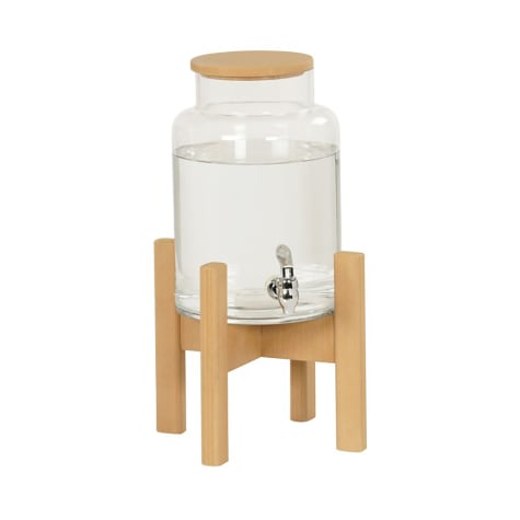 The Cal-Mil 23444-2-122 is a 2-gallon beverage dispenser with an ice tube. Constructed from glass with a base of upcycled rice hulls, this dispenser is designed to keep drinks cold and accessible, perfect for any buffet or catering setup.
