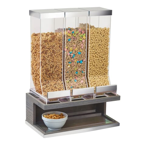 This 3 bin cereal dispenser from Cal‐Mil is part of the Ashwood Collection and allows you to serve different types of cereal. The base features gray‐stained oak and a metal frame and will add an upscale look to any breakfast bar or buffet. This dispenser can also be used for dry food, such as granola. Simply pull the lever and dispense the desired amount.