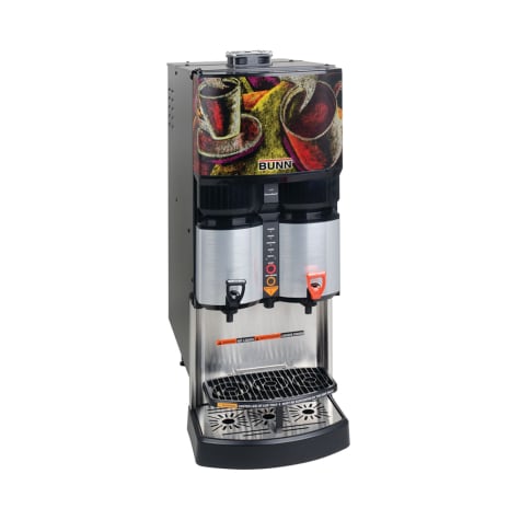 This Liquid Coffee Dispenser from Bunn is a low-to-medium volume coffee-on-demand dispenser for shelf stable products. It accommodates 1⁄2 gallon (1.9L) and most 1 gallon (3.8L) bag-in-box (BIB) containers.