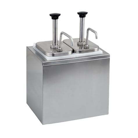This stainless steel condiment dispenser from Winco is designed for efficient use in busy food service settings. Crafted from high-quality 18/8 stainless steel, this dispenser features two heavy-duty pumps that draw out between 1 oz and 1-1/4 oz of condiment, depending on viscosity. It comes with removable plastic fountain jars and is perfect for creating an organized and user-friendly condiment station in your restaurant, concession stand, or buffet.