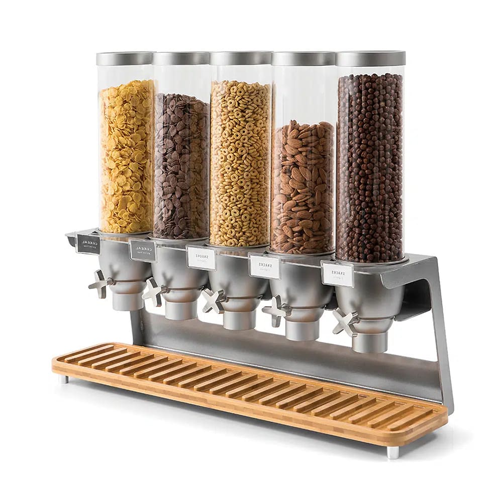 The EZ‐SERV is a free‐standing dispenser with a bamboo tray and five tall acrylic cylinders with a steel frame to create a distinctive, vertical presentation. The EZ‐SERV cereal dispensers will keep your cereal fresh for longer periods and is easy to clean. This dispenser comes with a patented portion wheel that allows you to dispense cereal without breakage. Great for snacks as well.