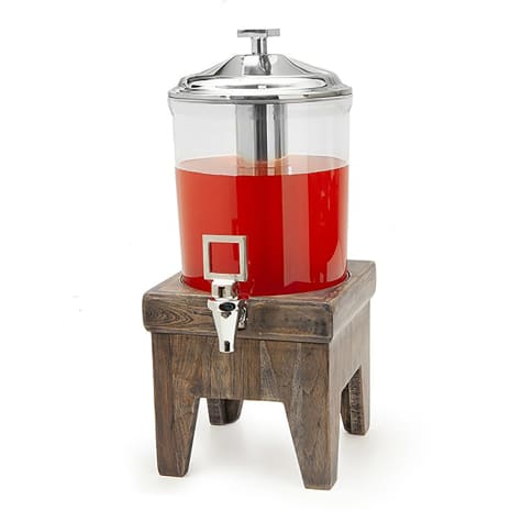 This 7 quart juicer/dispenser from D.W. Haber is part of the Fusion Collection and features a recycled teak lumber base in ash gray and will bring an upscale, rustic look to your buffet.