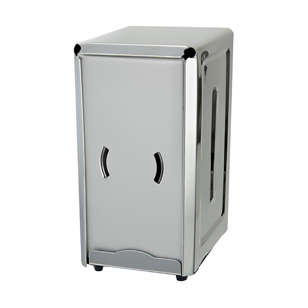 This stainless steel napkin dispenser fits 3.5" x 7" napkins and is perfect for any tabletop!