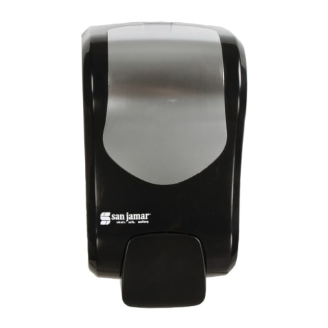 This San Jamar Rely black hybrid electronic, touchless soap dispenser dispenses bulk liquid, lotion, foam soap and hand sanitizer. It will switch to manual when the batteries are low. Mounts easily with adhesive or screws.