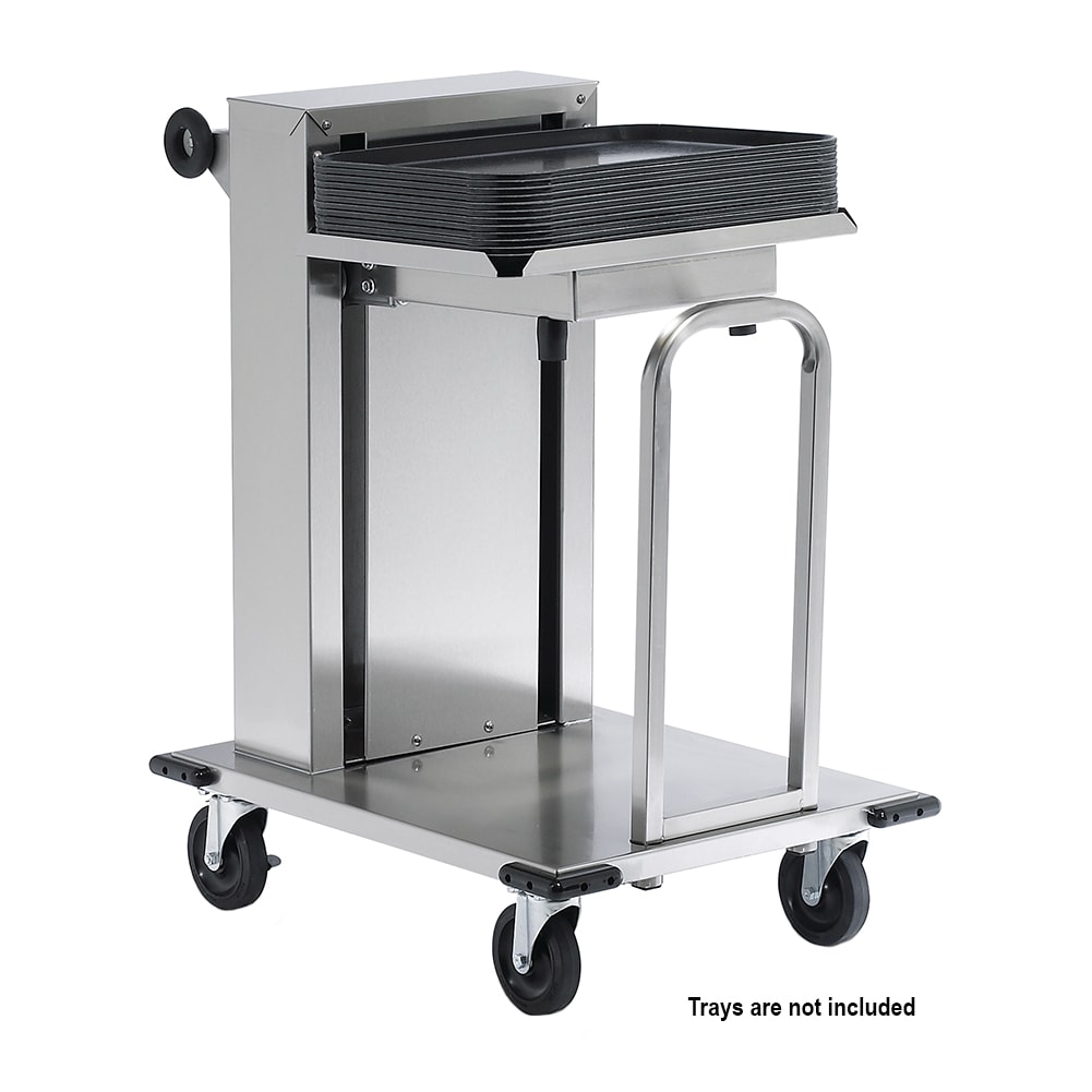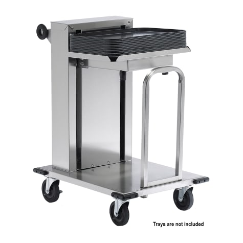 This Cantilever Style Tray Dispenser from Dinex® facilitates more access to meal trays and can hold 100 trays with a max tray size of 15" x 20". The self-leveling mechanism increases productivity during meal production by automatically dispensing trays.