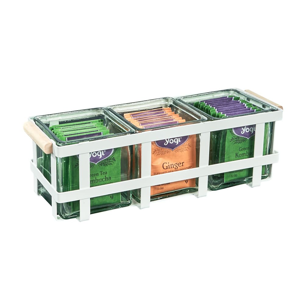 The Cal-Mil 22440-3-71 is a practical condiment organizer featuring a white metal tray with handles and three clear glass jars. Measuring 12.75" x 4.25" x 4", this organizer is perfect for cafes, coffee shops, and hotels, making it easy to offer condiment packets, stirrers, and tea bags in style.