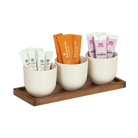 The Cal-Mil 23204-78 is a stylish condiment jar display featuring a walnut wood base and three modern white round jars. Ideal for condiments, bar fruits, and more, this display is perfect for enhancing the presentation of your buffet or bar area.